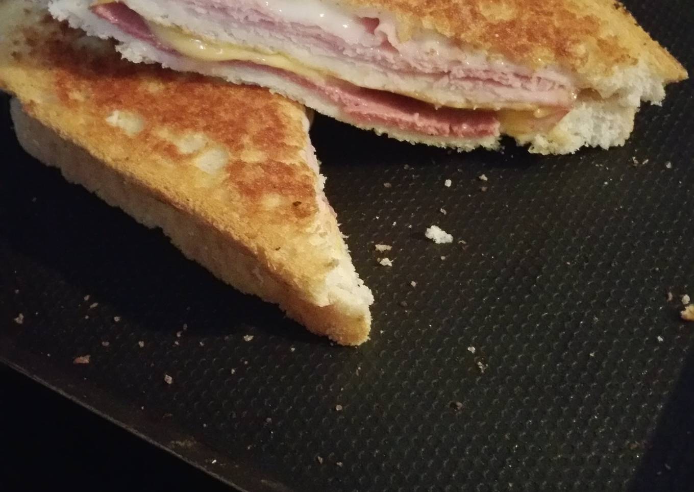 - Put white cheese on the bread and top with ham than orange cheese than cotto salami put other buttered bread face up butter on top