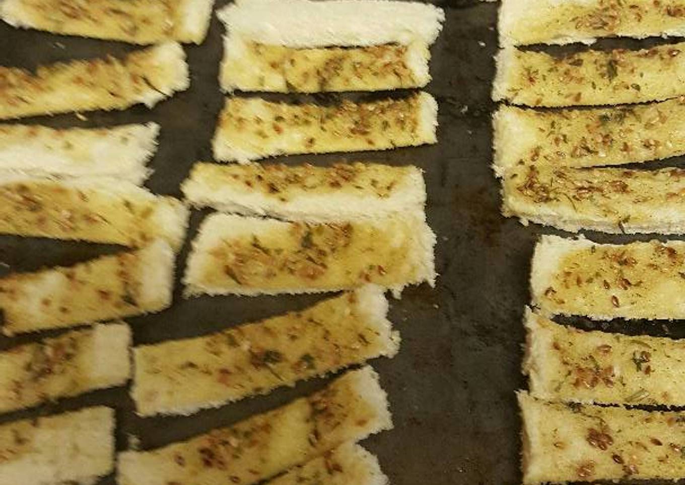 - Spread butter mixture over 1 side of each slice of bread. Cut each slice into 4 equal strips. Arrange the strips, butter side up, on the prepared pans.
