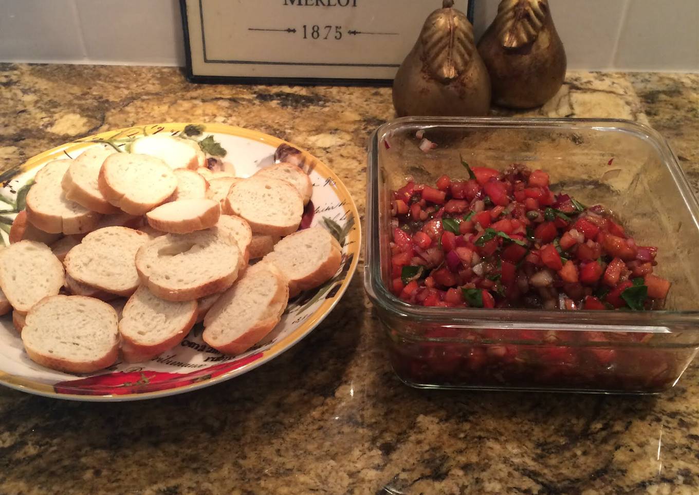 - 1 loaf French bread sliced thinly and put under the broiler for a few min