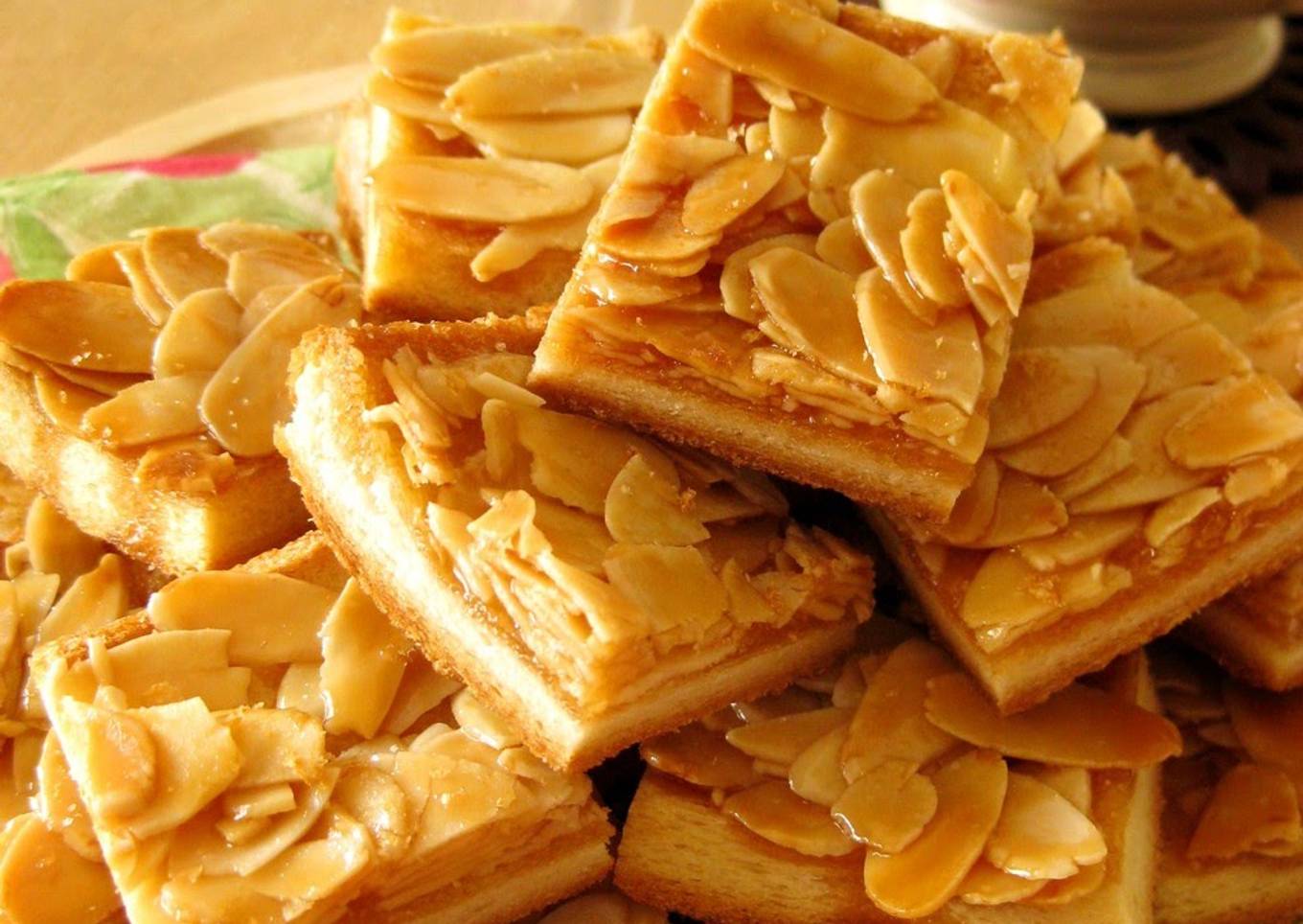 - From the side, rich layers of almond and caramel on a crispy base of toast! It's irresistible!