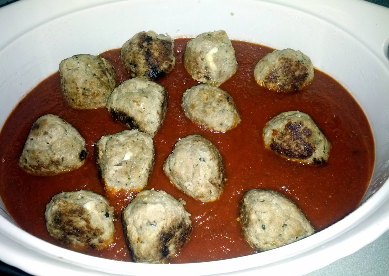 Instructions to make to make mozzarella stuffed turkey meat balls in a red sauce.