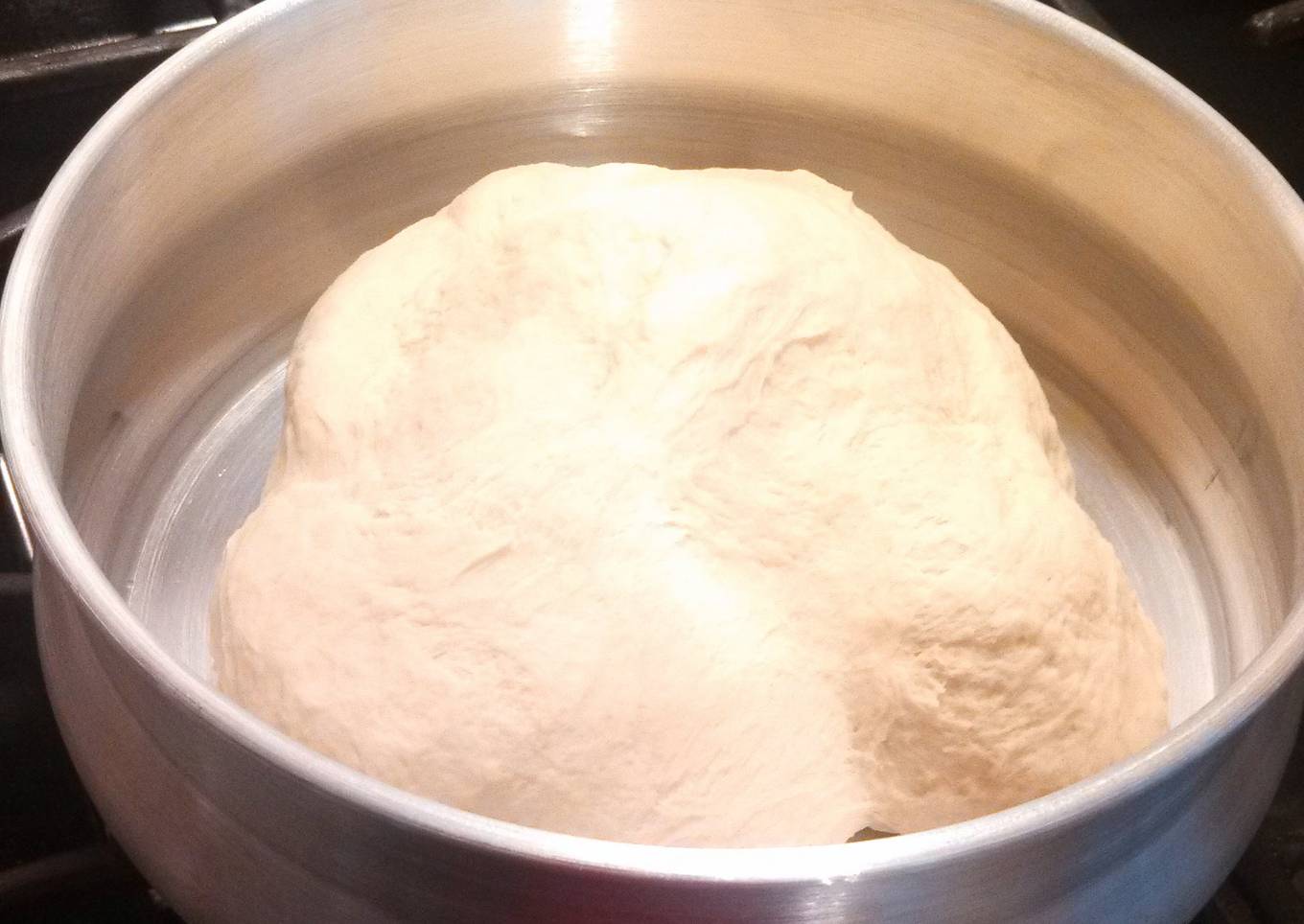 - put water in a metal bowl (I use 5qt. kitchen aid mixer with a dough hook) add yeast,sugar,salt, and olive oil and mix until dissolved. add the flour a little at a time and mix until dough pulls away from sides of bowl and is on hook. mix on low for 4 minutes. let the dough rest for 5 minutes then mix again on med low setting for an additional 2 minutes. immediately divide the dough into 3 equal pieces. round each piece into a ball and rub with olive oil. place each ball in a zippered bag or dough container and refrigerate overnight or freeze any pieces you will not be using the next day. The next day remove the dough 2 hours prior to use to allow the gluten to relax and remove the chill.