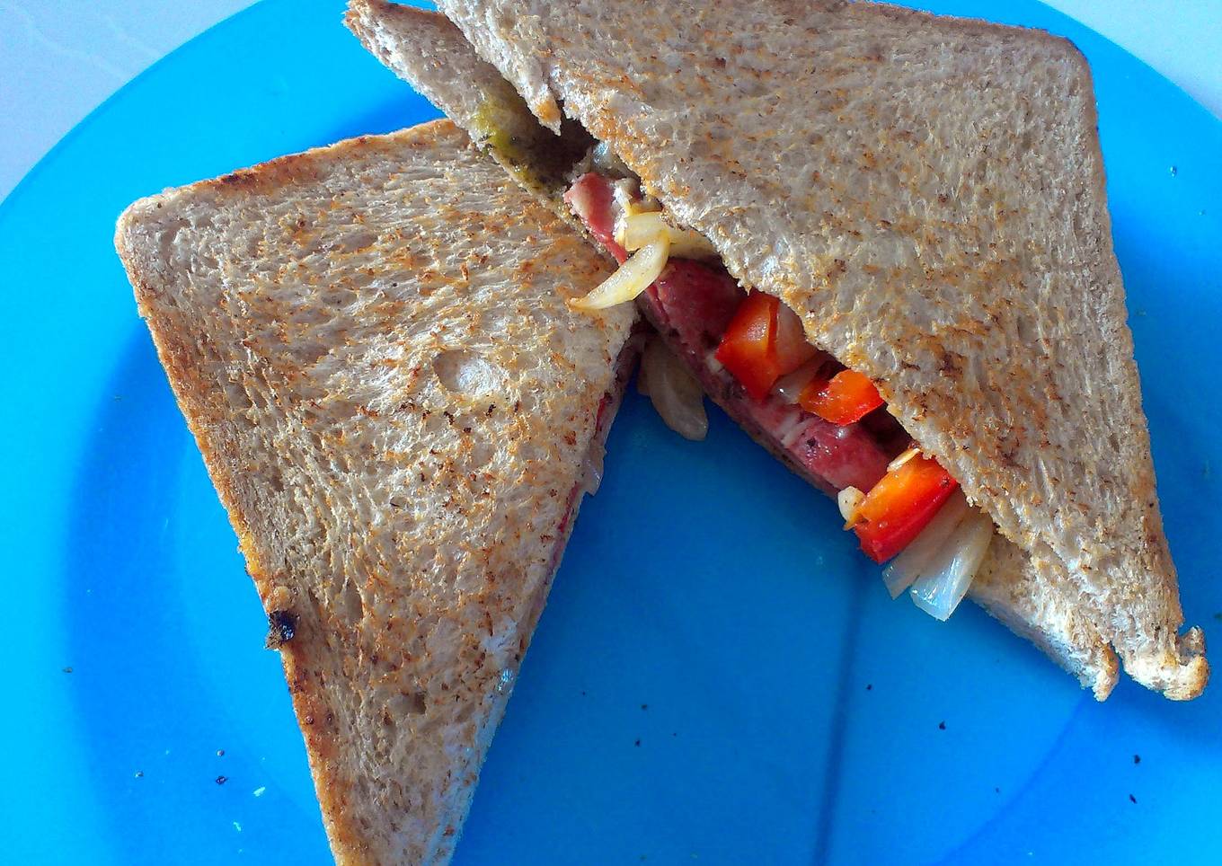 - now assemble time! do this repeatedly until you are done with all sandwhiches : slice if bread+smokedbeefwithcheese+caramelized toppings+slice of bread