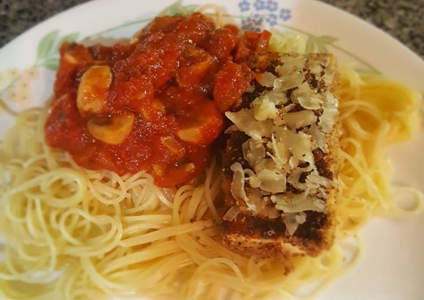 Tofu parm with mushroom marinara sauce, angel hair pasta