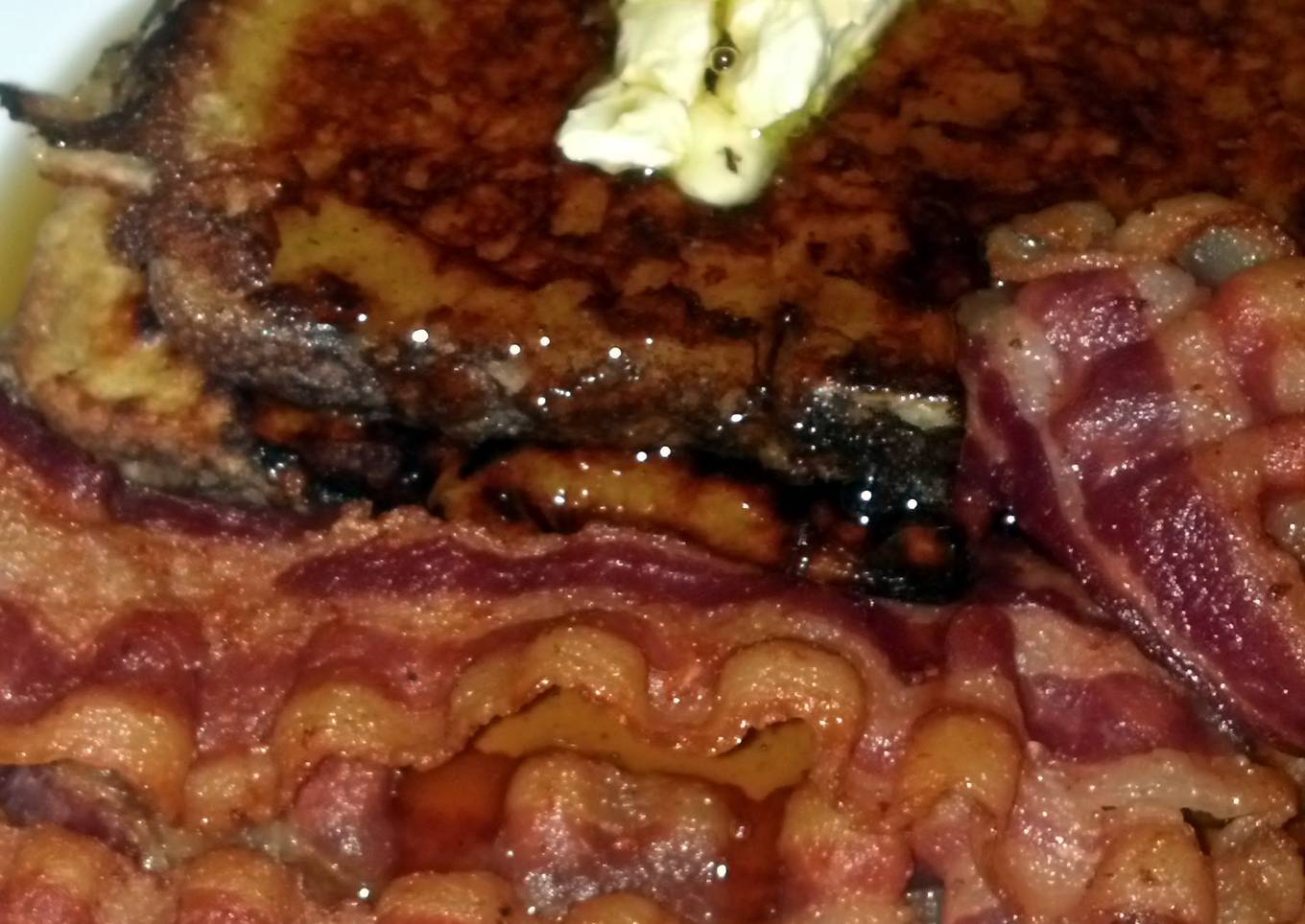- Add butter, syrup....top it off with 4-6 slices if bacon.. and there ya have it...SugaMamas French Kiss Pancakes & Bacon!