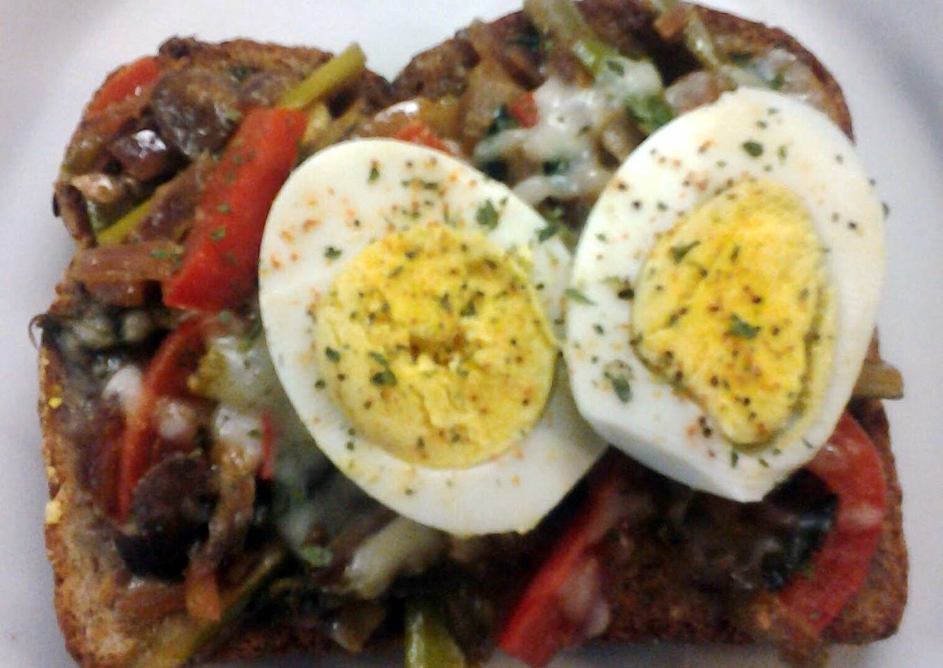 - Toast bread slice and spoon sautéed veggies over top. Sprinkle with shredded mozerella cheese to melt. (can pop it in the microwave for 10 to 15 seconds as well)