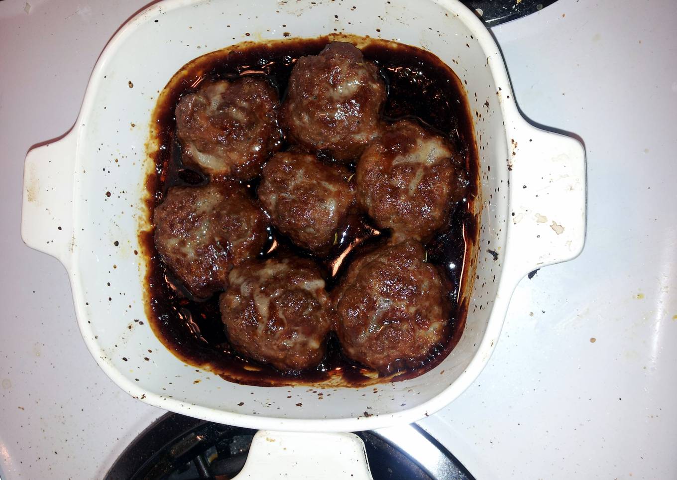 - mix hamburger and seasoning form into 10 balls and place in casserole dish