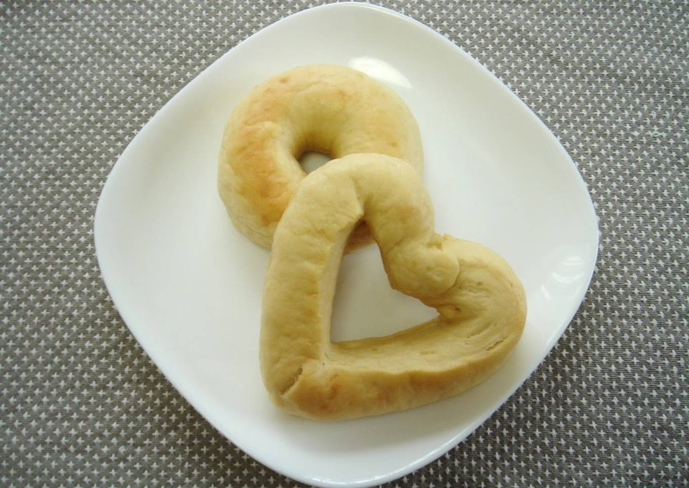 - Next take the dough and divide it then form the dough into bagel shapes. This time you can make it into heart shapes or the standard round shape. Let each side of the dough sit in the boiling water for 30 seconds and then bake it for 15-17 minutes and it's done!